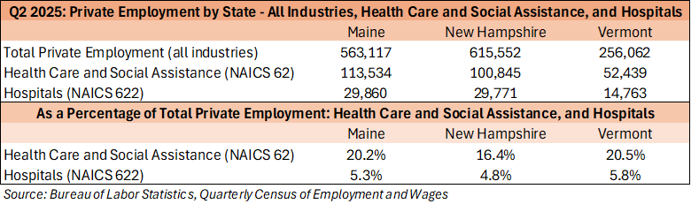 It is frequently stated that healthcare is one-sixth of the national economy. If anything, that undersells the significance of healthcare in the nation’s oldest region – healthcare represents more than one-fifth of private employment in both Maine and Vermont. Hospitals alone represent approximately one-twentieth of the region’s economy.