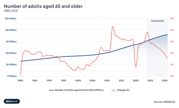 The number of individuals aged 65+ is a significant factor that drives demand for healthcare. While the size of that subpopulation will continue to grow, the rate of growth of the senior population is unlikely to reach current heights ever again.